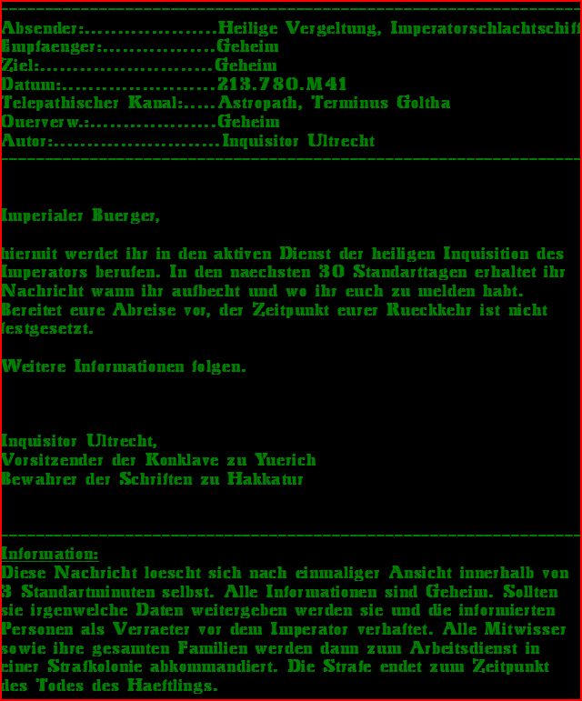 Im Namen des Geheiligten Gottimperators von Terra melde ich mich hiermit Freiwillig um dem Goldenen Thron zu dienen und dieses Universum von Ketzern und Mutanten zu Befreien.