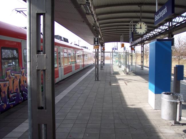 So, nun sind wir ein Häuschen weiter: Das ist der S-Bahnhof München Flughafen. Da bin ich dann als nächstes hin. Zu Fuß wär ich nicht weiter vorgekommen, da kommt ja das Vorfeld. Also kann man nur mit der S-Bahn weiter.