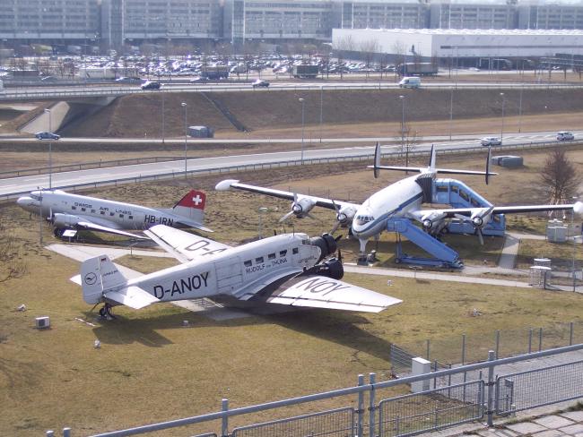 Neben dem Hügel, und von oben gut zu sehen, ist auch eine kleine Flugzeugausstellung. Im Vordergrund eine Ju 52 aus den 30er Jahren, rechts eine Super Constellation der Lufthansa, wie sie in den 50er Jahren geflogen ist, dahinter, das Modell weiß ich leider nicht.