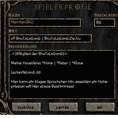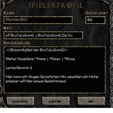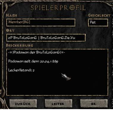 4.1 Jedes Mitglied der BG muss im Charakternamen das Kürzel BG-;BG_;-BG;_BG;Brutalo;Brutale;Brutalo- oder Brutale- tragen. Die Ausnahme bilden dabei zwei Slots auf dem Hauptaccount des Mitgliedes, welchen es freisteht, wie sie zu heißen haben.