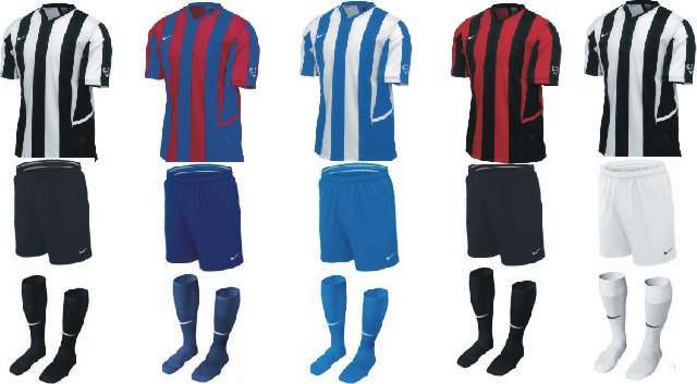 Nachdem wir uns darüber einig geworden sind, dass wir gestreifte Trikots nicht generell ausschließen würden und Flo am liebsten gestreifte Trikots hätte, habe ich ein paar mögliche Farbkombinationen zur Ansicht zusammengestellt. Es ist unschwer zu erkennen, welche Vereine als Vorbilder fungierten (v.l.n.r.: Juve 03/04, Barcelona, Porto, Milan, Juve 04/05). Ich denke, dass die ersten beiden Vorschläge ernsthaft diskutiert werden könnten.